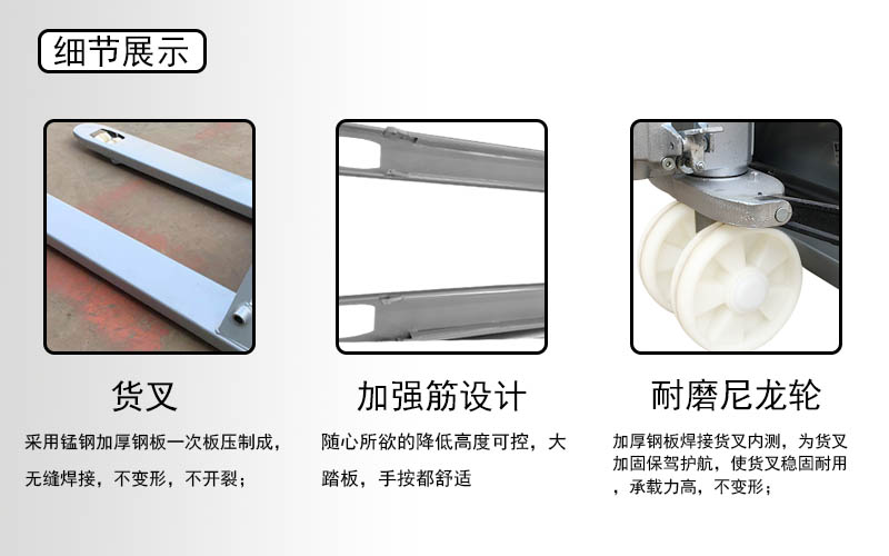 3t手動搬運車車身采用三菱全自動機器人焊接,位置準確,焊接標準化,焊口平滑美觀,焊接牢固不開裂;3t手動搬運車采用整體油缸,防漏油,免維護,內置進口密封圈,整體閥芯等配件;3t手動搬運車加厚加筋,提高強度,確保搖臂載重不易變形。產品規格: