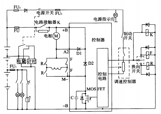 上圖是柯蒂斯 PMC1204/05 型調(diào)速控制器控制電動牽引車的電路。圖中電動機的主電路,由蓄電池、電路主熔斷器 FU4、電路接觸器 K 的觸頭、電動機的電樞和磁場、方向接觸器的觸頭、功率晶體管和續(xù)流二極管等組成。電路接觸器 K 的觸頭閉合時,接通方向接觸器 F的常開觸頭(同時其常頭斷開驅(qū)動電動機的工作電流則由控制器中的 MOSFET 功率晶體管控制,電動機將通電正轉(zhuǎn),車輛向前行駛。如下圖所示。
