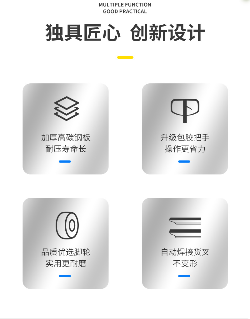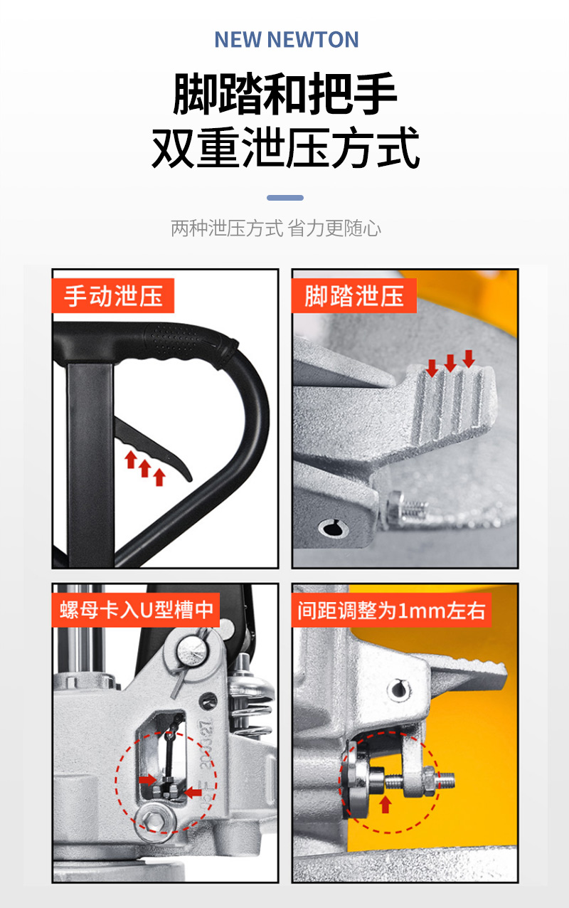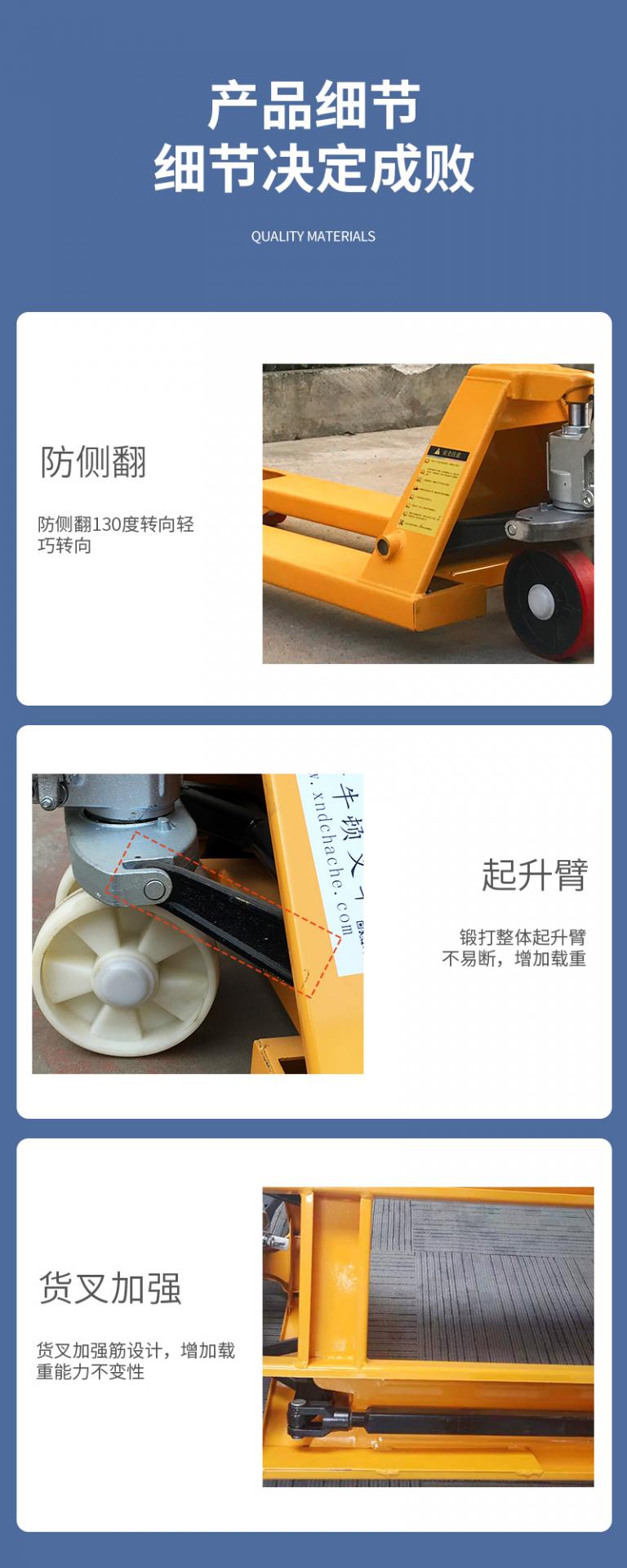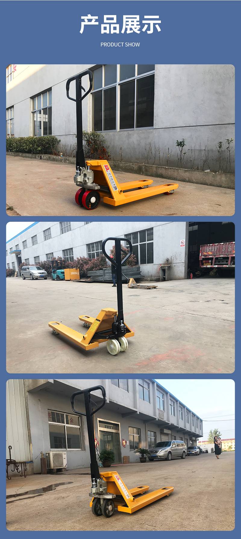 手動托盤搬運車主要包括:2噸2.5噸3噸手動托盤搬運車?手動叉車用什么托盤:川字或九腿的單面托盤,不可以用雙面托盤。手動托盤叉車噴塑表面,油漆更光亮更耐用美觀;手動托盤叉車輪子可定制為尼龍和鐵心聚氨酯輪胎;手動托盤叉車機械手臂焊接的接縫更牢固,使用壽命長;手動托盤叉車小幅度內(nèi)傾角設計,防止貨物傾斜,提高工作效率。產(chǎn)品規(guī)格: